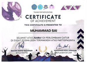 Muhammad Sai, mahasiswa Universitas Nahdlatul Ulama Kalimantan Barat, berhasil meraih Juara 1 pada perlombaan catur di ajang POSMA 2024.
